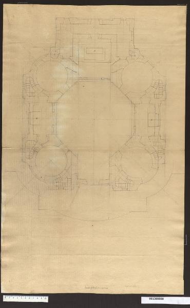 - NOTIZIE STORICO CRITICHE Il disegno si riferisce ad una cappella che sappiamo progettata per la città di Cracovia, da una scritta che Lorenz individua sulla sezione ad essa corrispondente, conservata in una collezione privata di Lucca (Lorenz 1991, p. 185 fig. 164).\nLa pianta prevede un vano centrale ottagonale con quattro cappelle circolari disposte lungo gli assi diagonali, che sporgono all'esterno con curvatura convessa, bloccata dai corpi rettilinei includenti i vani scala laterali. Anche la quasi impercettibile sporgenza convessa della parete di ingresso è analogamente frenata. I dettagli di questo incarico sono sconosciuti. Per ragioni di stile, Lorenz ritiene che sia alquanto improbabile una datazione ai primi anni viennesi, facendolo piuttosto risalire agli anni attorno, o subito dopo, il 1700. Per stile e tipologia questo edificio può essere accostato al progetto della chiesa del piccolo convento, progettato forse per il conte Harrach (Milano, Collezione Sardini Martinelli inv. 9,32) o a quello per la "chiesola" per il principe del Lichtenstein (Biblioteca Statale di Lucca, ms. 1856, f. 427r).