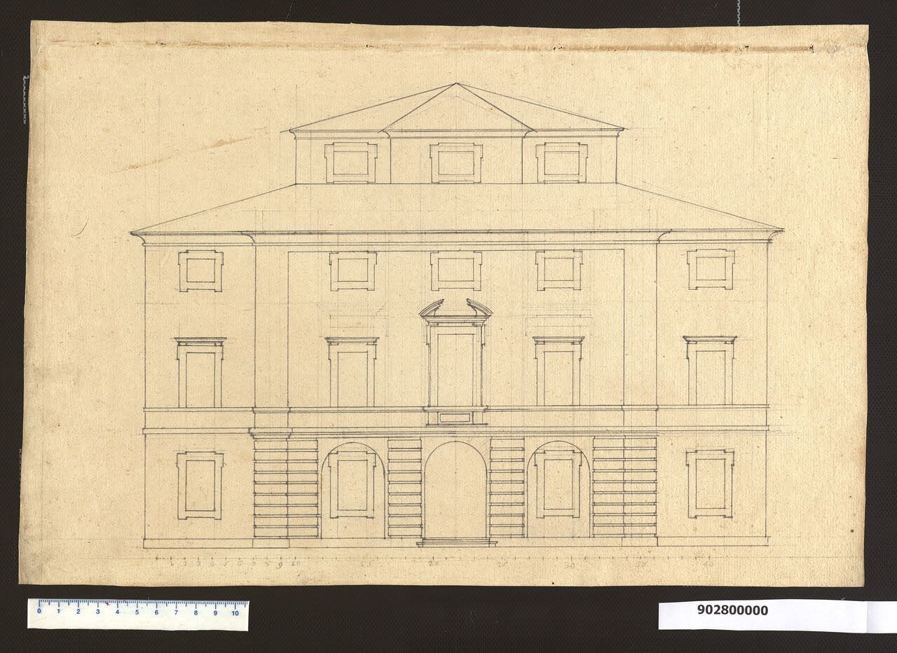 - NOTIZIE STORICO CRITICHE Il marchese Giacomo Sardini, nella ricerca di idee per la ristrutturazione della propria villa, aveva sollecitato disegni agli artefici con i quali era in contatto (vedi Milano, Collezione Sardini Martinelli, inv. 9,76; 9,31) ed anche curato in prima persona la stesura di alcune ipotesi. Il presente disegno, attribuibile a Sardini per confronto con altre sue tavole architettoniche, si direbbe un primo passo della stesura "in buona forma" del prospetto schizzato su un altro foglio (Milano, Collezione Sardini Martinelli inv. 9,110a). La costruzione è incardinata su un salone centrale ottagono la cui esistenza è resa manifesta dalla struttura a tiburio che sovrasta le coperture. L'edificio, a due piani con mezzanini, è di perimetro quadrangolare scandito in tre parti; il salone si inscrive in quella centrale che si evidenzia in facciata per la presenza del bugnato. Una cornice marcapiano divide il piano terreno dal piano nobile. Il corpo aggettante è inquadrato al piano terreno da pilastri a bugnato e, ai livelli superiori, da fasce verticali. Il piano terreno, presenta tre arcate entro pilastri rivestiti in bugnato che sembrano disegnare un finto portico. L'accesso attraversa l'arco centrale, mentre gli archi laterali sono ciechi e sulla loro parete si aprono due finestre. In asse con l'arco di ingresso, al piano nobile, spicca una porta finestra con timpano spezzato di sapore manierista. Per il profilo delle finestre si legge, nei tratti a grafite rimasti sotto la stesura a penna, una ripetuta ricerca della soluzione ottimale. L'incertezza maggiore che il disegno lascia trasparire è quella del raccordo tra la volumetria interna e quella esterna. La ristrutturazione definitiva seguì forme del tutto diverse da quelle delineate in questa tavola. La villa fu demolita intorno al 1930.