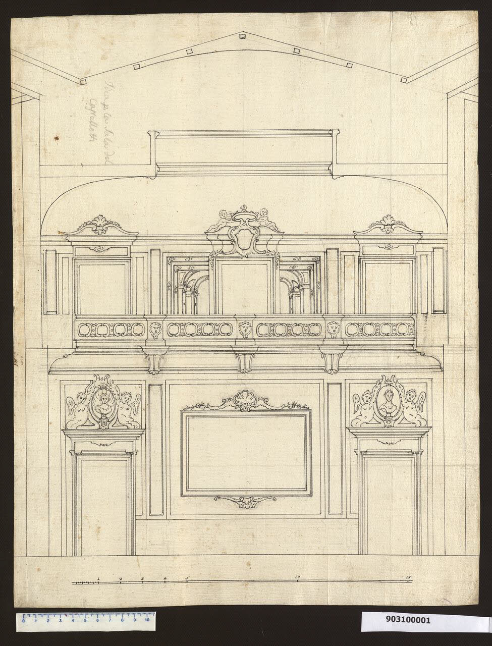 - NOTIZIE STORICO CRITICHE La paternità del disegno è dichiarata, sul foglio, da un appunto del collezionista, il marchese Giacomo Sardini. Egli, per la ristrutturazione della residenza di campagna, aveva abbandonato un più antico progetto (Milano, Collezione Sardini Martinelli, inv. 7,13, pubblicato in Sabatini, 1993, p. 63), probabilmente commissionato da Lodovico Sardini, tutore e zio di Giacomo. Dopo aver interpellato il capomastro Michelangelo Lippi per marginali interventi (Milano, Collezione Sardini Martinelli inv. 9,42; 9,87), pensò di imprimere una svolta radicale alla costruzione. Si rivolse così a Lippi per un primo schema di riforma (ibidem 9,76) e tracciò egli stesso alcune ipotesi (ibidem 9,110a; 9,28; 9,26). In tutti i progetti l'idea ricorrente era quella di un salone centrale poligonale a doppio volume, mentre i pensieri per il perimetro esterno andavano via via verso una semplificazione, che riconduceva al tracciato rettangolare del più antico progetto e tendeva a privilegiare le visuali esterne ortogonali. I ripensamenti coinvolsero anche il perimetro del salone centrale come dimostra questo disegno con la sezione di un salone sviluppato su due livelli e con il piano superiore circondato da balaustrata poggiante su mensole. La balaustrata gira ad angolo retto come si vede dalla linea sulla quale è impostata la sezione. Al piano terreno, tra due porte riccamente ornate da sopraporta con busti all'antica sorretti da putti, campeggia una cornice il cui gusto barocchetto informa anche gli ornati delle aperture al livello superiore con uno stemma che domina centralmente. La ristrutturazione definitiva, attuata sulla base di un progetto fornito da Carlo Bianconi (Milano, Collezione Sardini Martinelli inv. 9,96; pubblicato in Dallaj, 2005, p. 42) seguì forme del tutto diverse da quelle delineate in questa tavola. La villa fu demolita intorno al 1930.