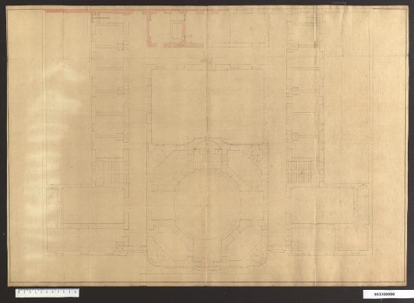 disegno in scala; è eseguito a grafite con tiralinee e compasso; le murature sono parzialmente acquerellate color rosa; il disegno è tracciato su carta pesante leggermente imbrunita. Il disegno presenta una marginatura a inchiostro grigio integrata al disegno nella parte superiore