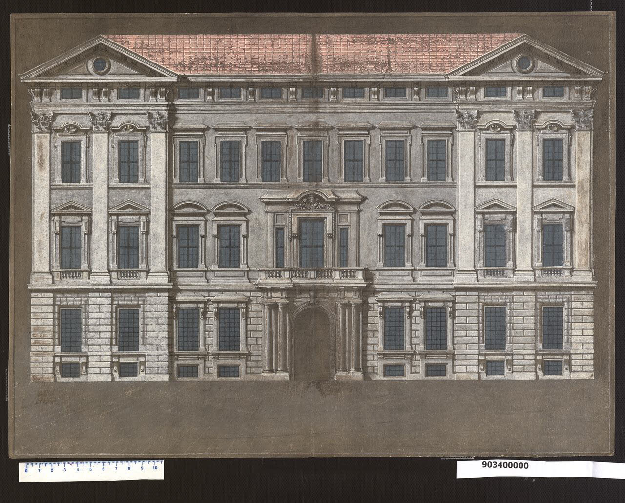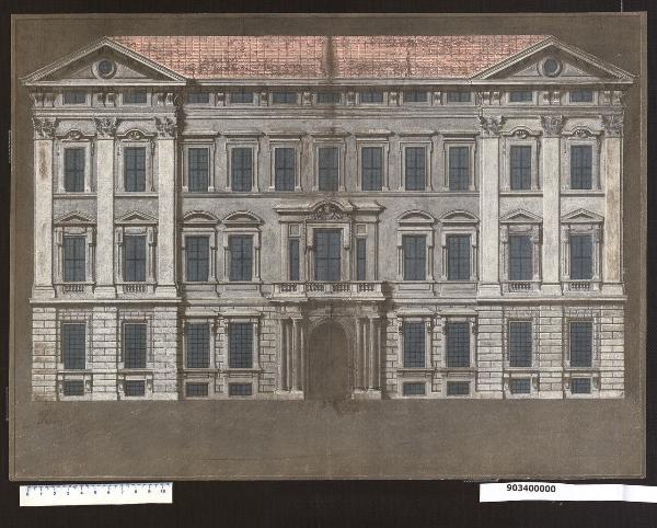 - NOTIZIE STORICO CRITICHE Il progetto di Domenico Martinelli doveva essere realizzato sull'area della Ringstrasse dove in seguito, tra il 1699 e il 1706, sarà costruito da Johann Bernhard Fischer von Erlach il palazzo per il conte Anton Batthyàny. I fratelli Johann Weikhard e Johann Michael conti Sinzendorf avevano acquistato il terreno il 9 aprile 1690; il 2 maggio 1692 Johann Michael aveva unito la parte di suo cugino Philip Ludwig e nel marzo 1696 aveva trasmesso a Johann Weikhard i disegni di Martinelli.\nNon è chiaro se Martinelli avesse eseguito questi disegni a Roma o a Vienna. Secondo Lorenz la data del progetto di Martinelli è compresa tra il 1690 e il 1696: anche dal punto di vista stilistico appartiene al primo periodo viennese.\nQuesto disegno, impressionante dal punto di vista della realizzazione grafica, attuata con la particolare tecnica messa a punto da Martinelli anche in occasione di altri disegni contenuti nella collezione (Milano, Collezione Sardini Martinelli inv. 9,1 e 4,6), rappresenta la facciata del palazzo, di cui sono pervenute a noi anche le piante di cinque piani (dal secondo al sesto-mezzanino, mentre il primo è andato perduto) e una dettagliata relazione sulle misure da rispettare durante la costruzione (Milano, Collezione Sardini Martinelli inv. 9,120; 9,121; 9,122; 9,123; 9,124 e 9, 123bis).\nRitroviamo qui il classico motivo di Martinelli del fronte di palazzo con ali aggettanti concluse da un timpano, che racchiudono la zona centrale, in cui risaltano, per contrappunto, il portale e la finestra centrale soprastante. L'edificio è perfettamente simmetrico rispetto all'asse centrale. La zoccolatura è trattata a bugnato rustico, che nelle ali si articola nei possenti pilastri su cui sono impostate le paraste giganti con capitello corinzio comprendenti i due piani superiori. A questo livello sono le piccole finestre del seminterrato e le finestre del piano rialzato, che Martinelli indica in pianta come secondo piano, più elaborate nella zona centrale, del tipo a edicola con tettuccio a pagoda sorretto da mensole a voluta, tutte comunque protette da inferriate.\nOltre il marcapiano, nella superficie intonacata risalti laterali e della zona centrale, si apre un'altra serie di finestre a edicola che presentano il classico repertorio di Martinelli, definito nei minimi dettagli e riscontrabile in diversi palazzi da lui progettati. Queste finestre al piano superiore hanno terminazione a frontone triangolare sorretto da mensole a voluta nei risalti laterali, sostituito da timpani curvilinei nella parte centrale, seguendo un ritmo aa, bb bb, aa; all'ultimo piano terminano con trabeazione arcuata con conchiglia centrale ai lati e con tettuccio a padiglione nella parte centrale. Una cornice separa i due piani ("nobile" e "di comodità") dal piano mezzanino destinato alla servitù, in cui Martinelli propone la consueta serie di piccole finestre rettangolari incorniciate e inframmezzate da coppie di mensole a voluta a sostegno dei timpani e del cornicione.\nParticolare importanza assume come sempre nei palazzi barocchi il portale d'ingresso, ad arco a tutto sesto con chiave centrale, affiancato da una coppia di possenti colonne binate alla cui sommità si appoggiano le mensole che reggono il balcone balaustrato soprastante. Su questo si affaccia la finestra di quello che doveva essere l'ambiente di rappresentanza, costituita in realtà da una grande porta-finestra centrale con cornice affiancata ai lati da due finestre rettangolari più strette, chiuse lateralmente da paraste, e tutte riunite da un tettuccio a pagoda. Quest'ultimo in corrispondenza dell'apertura centrale si eleva con un arco per contenere un motivo decorativo centrale con testa e festoni laterali. I frontoni alla sommità delle ali laterali presentano un oculo centrale.