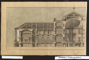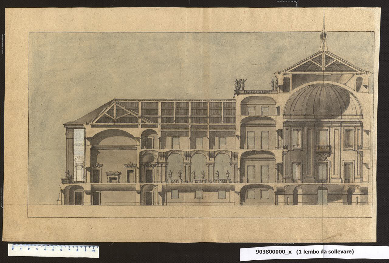 - NOTIZIE STORICO CRITICHE Il disegno rientra tra quelli del progetto che Martinelli redige per Carlo Agostino Malaspina (1671-1722), marchese di Fosdinovo. Dato che nella "Annotazione concernente l'esecuzione del Palazzo da erigersi nuovamente in Caniparola, Villa di… Marchese di Fosdinovo" (Biblioteca Statale di Lucca, ms. n. 1856, ff. 62r-67v) redatta dallo stesso Martinelli, si cita quale committente il “marchese di Fosdinovo”, disponiamo di un termine post quem per la datazione del progetto che è appunto il riconoscimento del titolo di marchese di Fosdinovo, conferito al Malaspina nel 1693, da Leopoldo I. Il progetto è forse maturato durante il soggiorno del Martinelli in Italia nel 1699-1700, ma ancora più probabilmente solo dopo il suo ritorno definitivo in patria nel 1705 (per lo stesso committente ideò un progetto di trasformazione del castello di Fosdinovo). Il disegno raffigura la sezione trasversale della parte destra della villa, nella soluzione che prevede il portico a serliana al primo piano. Come nel prospetto (Milano, Collezione Sardini Martinelli inv. 9,36), anche qui, emerge il volume del nucleo centrale, sopraelevato per contenere la copula della grande sala centrale rotonda. Questa ha le pareti suddivise da lisce lesene giganti specchiate, prive di capitello, che reggono la trabeazione. Per gli ambienti laterali non vengono date particolari indicazioni circa la decorazione, solo nella sala che si affaccia sulla terrazza a sinistra, anch'essa a tutta altezza, porte e camino hanno i profili più elaborati. In corrispondenza della porta esterna che si affaccia sulla terrazza è incollato un pezzo di carta raffigurante una variante della medesima porta, che si differenzia per una maggiore altezza del sopraporta.