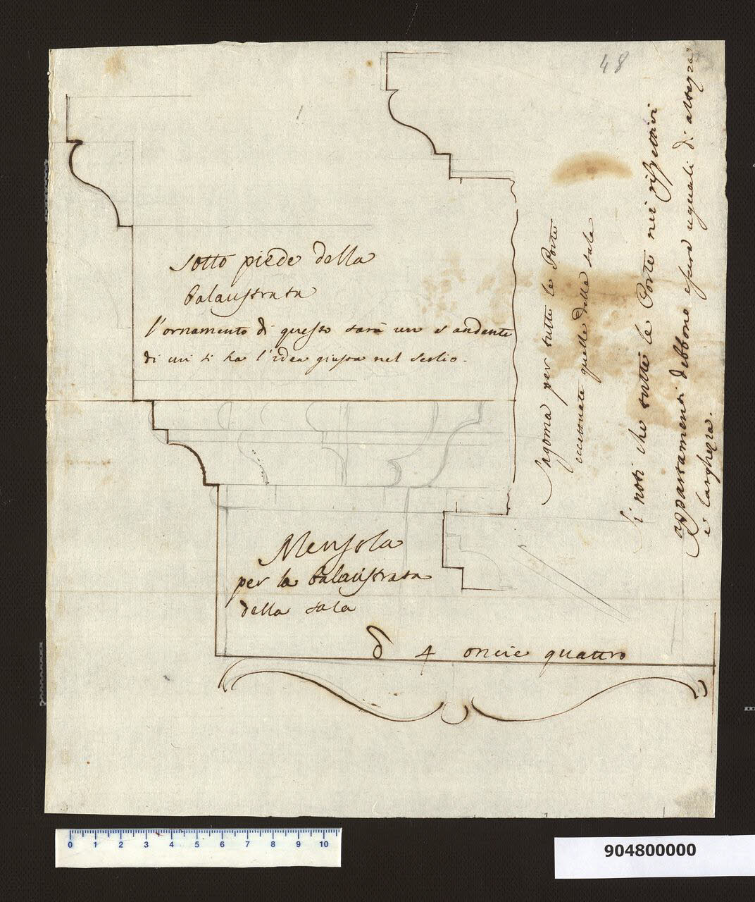 - NOTIZIE STORICO CRITICHE Il dettaglio delle sagome degli ornati riguardanti il sostegno della balaustrata e le cornici di alcune porte della villa Sardini a Pieve Santo Stefano venne inviato al committente da Carlo Bianconi con lettera del 2 maggio 1775 (Archivio di Stato di Lucca, Archivio Sardini =AS, cart. 141, n. 83) che conteneva anche il disegno di presentazione per l'assetto interno di sala e salotto e quello con i dettagli per gli ornati esterni delle finestre (Milano, Collezione Sardini Martinelli inv. 9,96 e 9,55). Nella lettera di accompagnamento Bianconi auspicava che la soluzione di classica eleganza fornita nel disegno in esame risultasse la preferita rispetto a quella delineata nel disegno di presentazione, più vicina invece ai gusti del committente.\nGiacomo Sardini, dilettante di architettura, curerà le tavole esecutive e non accoglierà la presente proposta (Milano, Collezione Sardini Martinelli, inv. 9,67).