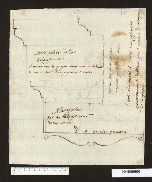 Particolari della balaustrata e sagoma delle cornici per le porte del salone al piano nobile della Villa Sardini a Pieve Santo Stefano. Particolari della balaustrata e sagoma delle cornici per le porte del salone al piano nobile della Villa Sardini a Pieve Santo Stefano