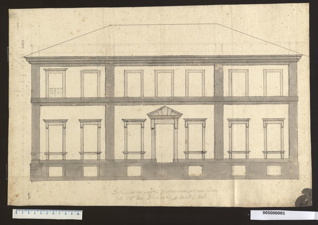 - NOTIZIE STORICO CRITICHE Una volta consolidato l'intento di mantenere un impianto rettangolare per la ristrutturazione della propria villa, Sardini sottopose le proprie ipotesi al parere dell'architetto bolognese Carlo Bianconi, conosciuto attraverso la comune amicizia con il paesaggista Lorenzo Moni. Un fitto carteggio aperto a partire dal dicembre 1773 tra Sardini e Bianconi documenta la genesi del progetto per la villa a Pieve Santo Stefano, progetto scaturito attraverso lo scambio di disegni e pareri a proposito della facciata e della decorazione degli ambienti principali. Dalla corrispondenza si viene a sapere che Bianconi aveva visto lo schizzo del "palazzino" di Pieve Santo Stefano inviatogli da Sardini; sulla base di quanto aveva potuto capire e senza avere dati precisi sulle unità di misura lucchesi, l'architetto aveva poi inviato al marchese i disegni, purtroppo non conservati, per gli ornati delle finestre "a fregio piano": lo attestano le lettere del 27 aprile 1774 e del 20 febbraio 1775 (Archivio di Stato di Lucca, Archivio Sardini, cart. 141, nn. 74, 81). \nSardini aveva apprezzato la foggia delle finestre ricevuta da Bianconi e, con tutta probabilità, la ridisegnò nella tavola in esame. Qui è sviluppata parallelamente un'idea per nobilitare il portale arricchendo il timpano del frontone triangolare con conci giganti, poggianti sull'architrave rettilineo.\nAnalogamente ad un pensiero preliminare (Milano, Collezione Sardini Martinelli inv. 9,28) il prospetto è diviso in tre settori sottolineati da fasce verticali; anche qui i due livelli di cui si compone l'edificio sono separati da una cornice marcapiano; di nuova concezione è il basamento con aperture rettangolari per i sotterranei. Il basamento e le incorniciature a fasce che scandiscono la struttura sono evidenziati dall'acquerello grigio, forse sottintendendo l'uso di pietra. Rivela continuità con il precedente prospetto anche l'accenno di rivestimento bugnato che è proposto a grafite sul basamento in corrispondenza delle fasce. Non è chiara la funzione di una balaustrata sommitale accennata a grafite. Mancano dettagli sulle modalità di accesso e forse il disegno raffigura il prospetto secondario.\nLa ristrutturazione definitiva seguirà forme di impronta palladiana (Sabatini, 1993), del tutto diverse da quelle delineate in questa tavola. La villa fu demolita intorno al 1930.