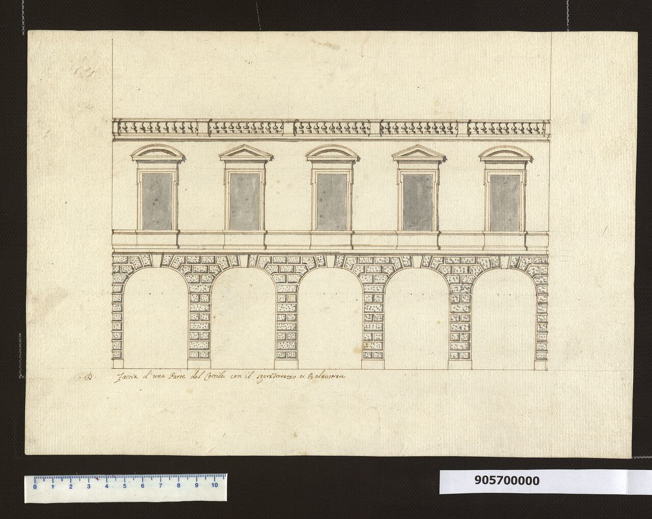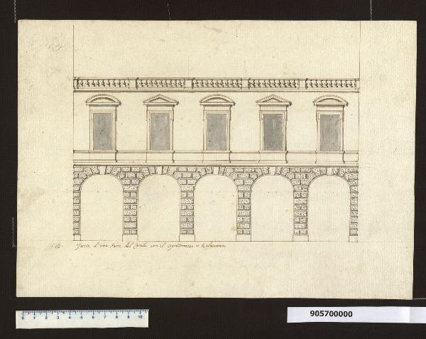 - NOTIZIE STORICO CRITICHE Il prospetto rappresentato nel disegno riguarda il cortile di palazzo Kaunitz-Liechtenstein a Vienna ed è riferibile alla prima fase di progettazione e costruzione del palazzo da parte di Henrico Zuccalli per il conte Dominik Andreas Kaunitz.\nL'attribuzione a Zuccalli è resa possibile dal confronto con altri disegni certamente di sua mano, in quanto firmati, presenti all'interno della collezione e in particolare la facciata per il castello di Austerlitz (Milano, Collezione Sardini Martinelli inv. 2,2).\nSi tratta molto probabilmente del fronte est del cortile interno, riguardante quel tratto poi successivamente completato con la quarta ala dal principe Johann Adam Andreas Liechtenstein, che aveva acquistato l’edificio ancora in fase di costruzione da Kaunitz.\nNon è certo se questo fronte fosse già stato realizzato da Zuccalli, anche se documenti citati da Lorenz (Lorenz 1991, MZ KAT 66 pag. 228) affermano che nel 1693 i due primi piani erano già stati completati e la costruzione era a livello del piano nobile fino all'imposta del mezzanino, in muratura rustica.\nL'ala est era rimasta tronca nel progetto iniziale, in quanto il conte Kaunitz non era riuscito ad acquistare il terreno necessario. Pertanto Zuccalli aveva concluso il cortile con un corpo più basso con un porticato, un primo piano e una copertura a terrazzo. Come si evince dal disegno, il porticato è costituito da cinque archi ribassati e il fronte è rivestito da un bugnato rustico a pianterreno fino all'alta fascia di marcapiano su cui sono impostate le corrispondenti finestre incorniciate del piano superiore. Queste sono caratterizzate da un'alternanza di frontoni triangolari e curvilinei. Il fabbricato termina con una balaustrata che in parte serve da parapetto per il terrazzo e in parte costituisce mera finitura, come si può rilevare dal disegno in sezione che presenta il fronte sud (Milano, Collezione Sardini Martinelli inv. 9,56).
