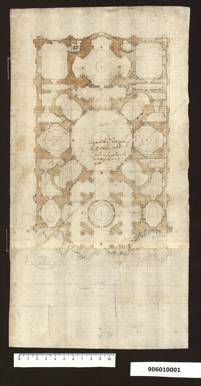 - NOTIZIE STORICO CRITICHE ll disegno rientra nel gruppo dei progetti, mai realizzati, che Martinelli elabora per il re di Polonia Jan III Sobiesky (1679-1696). Sono sconosciute le circostanze che portano Domenico Martinelli a progettare alcuni edifici per il re polacco, sono invece noti gli indirizzi della sua politica culturale e artistica, orientata principalmente verso Roma e all'ambiente dell'Accademia di S. Luca. Oltre a ciò, possono aver svolto un ruolo importante per i contatti con il Martinelli i rapporti personali del Sobiesky, che aveva come segretario personale Tommaso Talenti, proveniente da Lucca e, il fatto che il cardinale Francesco Bonvisi, lucchese, era l'inviato papale a Varsavia. Una data possibile per i progetti del Martinelli è quella del 1684, quando il re manda a Roma il suo confessore quale inviato artistico. Il presente disegno è tra quelli predisposti dal Martinelli per la chiesa monumentale, un progetto che prevede due fasi: la prima di studio della pianta e della facciata; la seconda alla soluzione definitiva della facciata, della cripta, della sezione longitudinale e della pianta del tamburo. Su questo foglio, riferito ancora alla prima fase, Martinelli traccia la prima proposta, molto vicina a quella definitiva, della pianta della chiesa. La costruzione spaziale è stata concepita sulla base di una griglia quadrata, e prevede tre spazi cupolati messi in sequenza, con predominanza di quello centrale per ampiezza e altezza. Calcolato sulle dimensioni totali, la sua luce di 30 m risultava però piccola, per cui a questo spazio centrale viene aggiunto un secondo anello alla quota del tamburo, così da coprire quasi l'intera larghezza dell'edificio (cfr. Milano, Collezione Sardini Martinelli inv. 9,5). In alcune parti, ad esempio nella zona del coro, si vede un chiaro riferimento alla chiesa dei SS. Luca e Martina di Pietro da Cortona; anche le numerose colonne addossate ai pilastri fanno pensare a Pietro da Cortona e al Rainaldi, che sono i riferimenti più importanti dell'attività romana del Martinelli. Ad un primo spazio su cui si aprono due cappelle circolari, e definito al centro da pilastri compositi, segue l'ampio vano ottagonale centrale, contornato da sei cappelle molto profonde, che introduce nella zona del presbiterio trilobato.