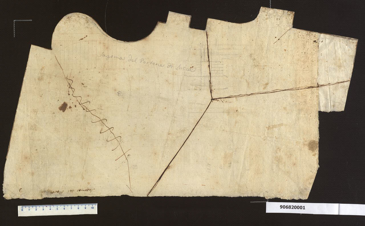 - NOTIZIE STORICO CRITICHE Il modano è stato realizzato per la costruzione del "portone di Lucca". Non è documentato con certezza di quale edificio facesse parte. Si ipotizza si tratti di Palazzo Sardini a Lucca, in quanto il disegno era accomunato ad altri modani e a un disegno sicuramente inerente al palazzo stesso (Milano, Collezione Sardini Martinelli inv. 9,68/1).\nIl disegno presenta una partizione in tre settori tracciata a inchiostro e una linea cancellata con tratti sempre a inchiostro. L'orientamento e la definizione della modanatura sono di difficile interpretazione. Sullo stesso foglio compaiono conti a matita e lo schizzo di una scala a pianta quadrata con gradini su tutti i lati eseguito a grafite.