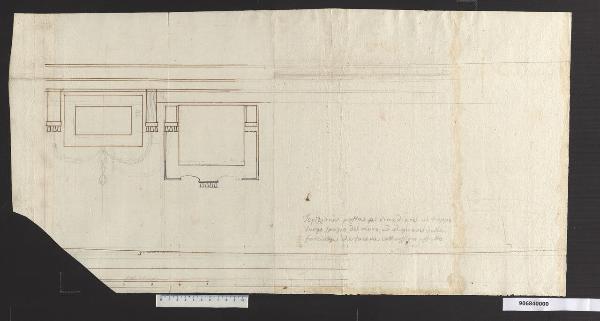 - NOTIZIE STORICO CRITICHE Il disegno rappresenta la lastra per un'iscrizione che, insieme agli stemmi sottostanti, era stata inserita da Sardini nella parte muraria piena della facciata in prossimità dell'angolo per ovviare alla sua sproporzionata larghezza rispetto alle parti piene tra le finestre. La lastra è affiancata da due volute che terminano con la stessa decorazione a dentelli che caratterizza la cornice della finestre, di cui una è rappresentata a lato.\nLa lastra, che riporta l'iscrizione: "SARDINI - RESTITUERE - A.S. MDCCVC" è situata a ridosso del cornicione del tetto ed è circondata nella parte inferiore da un doppio festone con pendente centrale, abbozzato a grafite nel disegno.