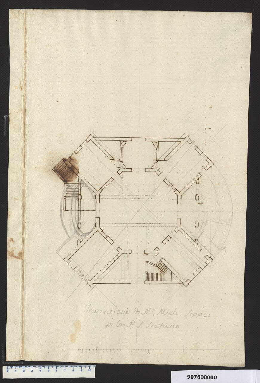 - NOTIZIE STORICO CRITICHE La paternità del disegno è dichiarata, sul foglio, da un appunto del collezionista, il marchese Giacomo Sardini. Il confronto del tracciato con la pianta delle preesistenze inglobate nel più antico progetto di ristrutturazione della villa Sardini, conservato nel tomo VII (Milano, Collezione Sardini Martinelli, inv. 7,13, pubblicato in Sabatini, 1993, p. 63), mostra come Sardini avesse ferma intenzione di abbandonare il progetto probabilmente commissionato da Lodovico Sardini, suo tutore e zio. Infatti tra il 1757 e il 1758 il padre di Giacomo, assente da Lucca per una missione diplomatica, aveva incaricato il fratello della "restaurazione della casa della Pieve" (Archivio di Stato di Lucca, Archivio Sardini (=AS), cart. 98, documenti 46 e 158). Il nipote, una volta subentrato nella gestione del patrimonio di famiglia, manifestò una certa preoccupazione per le spese che le idee dello zio avrebbero comportato in un momento carico di vincoli finanziari: "erami impegnato in una casa di campagna, che mio zio e tutore mi aveva costretto ad intraprendere per la quantità di fabbriche acessorie, che aveva egli preparato" (AS, cart. 128 Memorie ... M. Teresa Sardini, f.5). Dopo aver interpellato Lippi per marginali interventi (Milano, Collezione Sardini Martinelli inv. 9,42; 9,87), pensò di imprimere una svolta radicale alla costruzione. I primi pensieri erano orientati verso un casino di caccia su due livelli, dotato di salone e stanze per gli ospiti (dell'idea resta un manoscritto di Sardini, Milano, Collezione Sardini Martinelli inv. 9,108ter). Per un uso aggiornato della forma ottagonale, prevista dalla trattatistica cinquecentesca - in particolare dal Serlio - per questo tipo di edifici, Sardini disponeva di un modello autorevole da sottoporre a Lippi: la copia di un progetto per villa di Juvarra (Milano, Collezione Sardini Martinelli inv. 9,118; 9,119). L'idea di Lippi si focalizza sul salone ottagono centrale circondato da quattro vani rettangolari disposti a croce di sant'Andrea in modo da permettere dall'interno visuali in ogni direzione sul paesaggio circostante; sugli accessi alla villa con portici e scaloni; sugli affacci laterali nei quali erano disposti da una parte un piccolo ambiente ottagono con nicchie e dall'altra, verso il giardino terrazzato, una risalita secondaria.\nDell'edificio preesistente, rappresentato nel vecchio progetto, si sarebbero sfruttati diversi elementi: sui lati lunghi costruiti avrebbero dovuto insistere da una parte un lato dell'ottagono e dall'altra una delle due sequenze di pilastri; l'altra serie di pilastri combacia invece con i setti murari brevi dello scalone del vecchio progetto. Le linee centrali tratteggiate all'interno dell'ottagono corrispondono verosimilmente a muri dei quali si sarebbe dovuta prevedere la demolizione, muri che in parte corrispondono allo stato in pianta del fabbricato originario; la parte più consistente delle demolizioni avrebbe interessato l'area che sul vecchio progetto si trovava al di qua di una delimitazione tracciata a sanguigna, segno che il progetto stesso (7,13) era stato già posto in discussione o aveva subito modifiche in corso d'opera. Il senso di lettura del disegno di Lippi privilegia appunto questo lato. Lo scalone ad angolo ottuso per il prospetto posteriore è una citazione da un altro disegno conservato tra le carte di Sardini (Milano, Collezione Sardini Martinelli inv. 9,77). La definitiva ristrutturazione non tenne conto del progetto in esame. La villa fu demolita intorno al 1930.