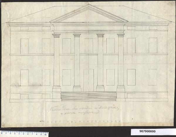 - NOTIZIE STORICO CRITICHE Per la facciata della propria villa Sardini matura, attraverso il consiglio di Carlo Bianconi, l'idea di una struttura parallelepipeda compatta dalla quale aggetta un pronao tetrastilo a colonne giganti con frontone triangolare, abbandonando la primitiva ipotesi di pronao a doppio ordine (Milano, Collezione Sardini Martinelli inv. 9,47r). Il piano dei mezzanini è contenuto nell'altezza prevista per la trabeazione. \nIl disegno venne sottoposto al giudizio di Bianconi che, con lettera del 31 maggio 1774, tenne a sottolineare alcuni difetti: lo zoccolo che Sardini aveva interposto tra il plinto e il piano del portico; l'esagerata dimensione delle finestre superiori, da contenere rispetto a quella delle inferiori; la forma della cornice marcapiano, da semplificare; e soprattutto la proporzione della colonna, troppo esile per l'ordine toscano dichiarato dalla base. L'edificazione definitiva, pur mantenendo il portico "palladiano" (Sabatini, 1993, p. 60) per il quale Sardini si era ispirato alle Ville Trissino e Badoer (Archivio di Stato di Lucca, Archivio Sardini, cart. 128: Memorie della famiglia Sardini, fascicolo 15), seguì forme diverse da quelle delineate in questa tavola. La villa fu demolita intorno al 1930.