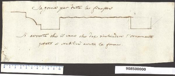 - NOTIZIE STORICO CRITICHE Il disegno è attribuibile a Carlo Bianconi in base all'esame della grafia e al confronto con altri modani realizzati per Sardini. Fa probabilmente parte delle tavole inviate al marchese Sardini con la lettera del 2 maggio 1775 (Archivio di Stato di Lucca, Archivio Sardini =AS, cart. 141, n. 83) che conteneva il disegno di presentazione per l'assetto della sala e del salotto della villa a Pieve Santo Stefano, nonché la precisazione di alcuni dettagli decorativi per l'interno e degli ornati esterni delle finestre. Nella lettera si accenna ad un metodo in uso nel bolognese per per rivestire gli ambienti con ornati all'antica, metodo consistente nell'inserire entro scanalature, appositamente lasciate vuote nel corso della costruzione, "cornici gettate di scagliola e modellate con attenzione sopra disegni di gusto scelto". L'iscrizione sul disegno accenna appunto al "vano che dee rinchiudere l'ornamento gettato" e corrobora l'ipotesi che il disegno sia riconducibile allo stesso contesto e in particolare all'ornato delle finestre all'interno della villa.\nSardini in seguito delineerà la soluzione definitiva per l'assetto degli interni della propria villa, discostandosi in parte dalle proposte di Bianconi (Milano, Collezione Sardini Martinelli, inv. 9,67); non è noto se il dettaglio tracciato sul modano in esame sia stato realmente messo in opera. La villa fu demolita intorno al 1930.