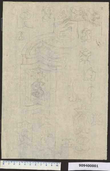 - NOTIZIE STORICO CRITICHE Il disegno presenta i primi studi di Giacomo Sardini per la realizzazione del portone della sua residenza di Lucca, che riguardano la rosta (inferriata a forma di ventaglio posta sopra la porta d'ingresso) e ipotesi di "sigle" relative alle iniziali del proprio nome ("S" e "G"), che pensava inizialmente di apporre all'interno di un riquadro dell'imposta, quasi a creare uno stemma di famiglia sovrastato da una corona.\nLa rosta rappresentata è simile nella composizione a quella di un disegno successivo più definito, anche se diversa da quanto realizzato (Milano, Collezione Sardini Martinelli inv. 9,125/5).