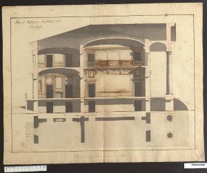 disegno in scala, conserva tracce della preliminare costruzione a grafite; a grafite è delineato uno studio di portico di altra mano; è eseguito a inchiostro bistro a penna, principalmente con tiralinee, a mano libera nelle parti ornamentali; le ombreggiature sono stese ad acquerello grigio mentre gli spessori delle pareti al filo della sezione sono indicati con acquerello rosa; il disegno presenta una marginatura a inchiostro bruno a penna e il supporto sul quale è tracciato è carta avorio pesante