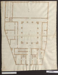 - NOTIZIE STORICO CRITICHE Si tratta della copia di un disegno conservato attualmente nel fondo Mascherino dell'Accademia di S. Luca a Roma. La scheda di catalogo dell'Accademia (n. 2389) lo assegna ad autore Anonimo. Sul foglio è rappresentata la pianta del piano terra di palazzo Aldobrandini, ora Della Provincia, in piazza Santi Apostoli a Roma, progettato nel 1585 ca. da Martino Longhi il Vecchio.