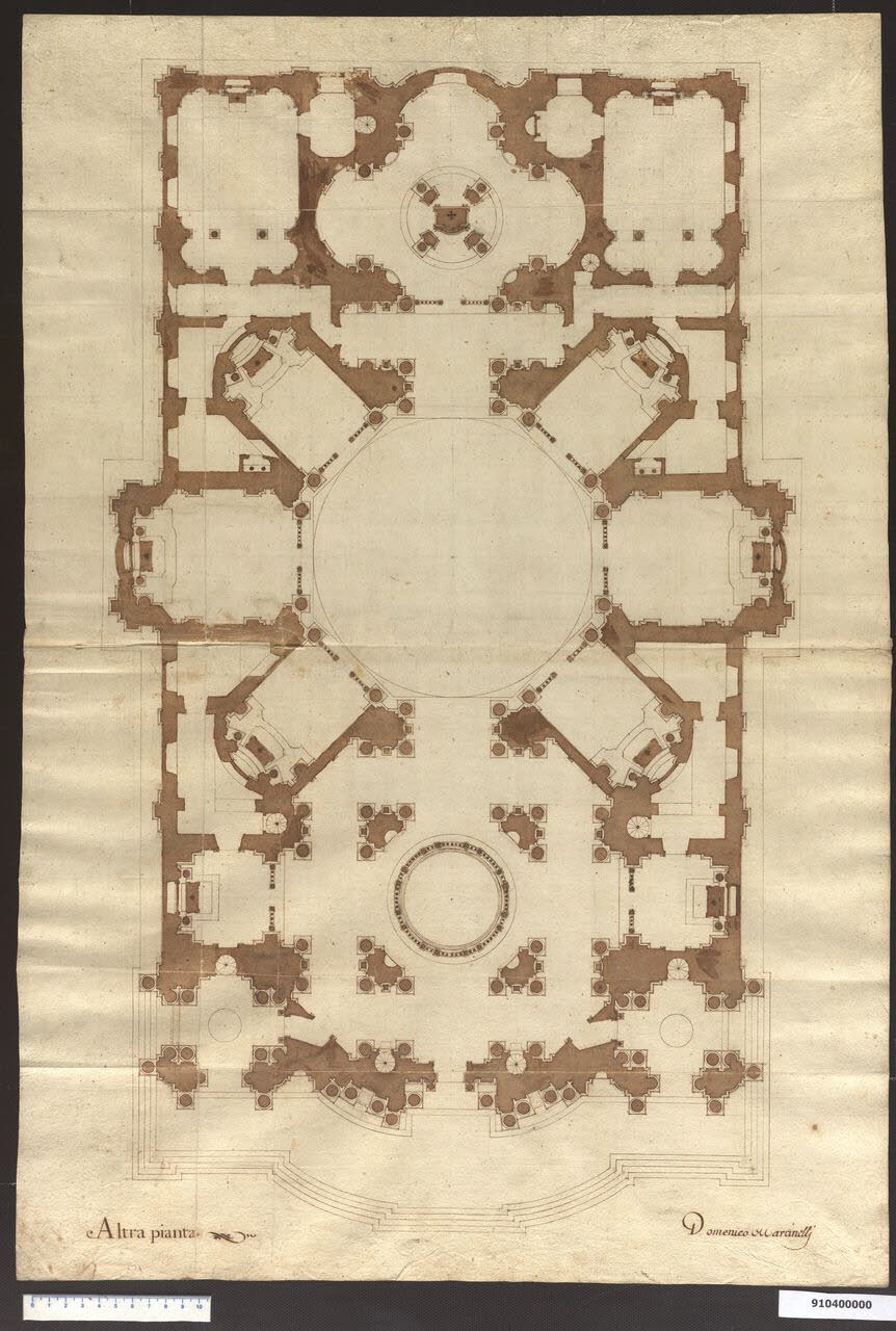- NOTIZIE STORICO CRITICHE ll disegno rientra nel gruppo dei progetti, mai realizzati, che Martinelli elabora per il re di Polonia Jan III Sobiesky (1679-1696). Sono sconosciute le circostanze che portano Domenico Martinelli a progettare alcuni edifici per il re polacco, sono invece noti gli indirizzi della sua politica culturale e artistica, orientata principalmente verso Roma e all'ambiente dell'Accademia di S. Luca. Oltre a ciò, possono aver svolto un ruolo importante per i contatti con il Martinelli i rapporti personali del Sobiesky, che aveva come segretario personale Tommaso Talenti, proveniente da Lucca e, il fatto che il cardinale Francesco Bonvisi, lucchese, era l'inviato papale a Varsavia. Una data possibile per i progetti del Martinelli è quella del 1684, quando il re manda a Roma il suo confessore quale inviato artistico. Il presente disegno è tra quelli predisposti dal Martinelli per la chiesa monumentale, un progetto che prevede due fasi: la prima di studio della pianta e della facciata; la seconda alla soluzione definitiva della facciata, della cripta, della sezione longitudinale e della pianta del tamburo. Su questo foglio, riferito ancora alla prima fase, Martinelli traccia la planimetria definitiva della chiesa. La costruzione spaziale era già stata in gran parte definita in un precedente disegno (Milano, Collezione Sardini Martinelli inv. 9,60 bis) e prevede tre spazi cupolati messi in sequenza, con predominanza di quello centrale per ampiezza e altezza. Calcolato sulle dimensioni totali, la sua luce di 30 m risultava però piccola, per cui a questo spazio centrale viene aggiunto un secondo anello alla quota del tamburo, così da coprire quasi l'intera larghezza dell'edificio (cfr. Milano, Collezione Sardini Martinelli inv. 9,5). In alcune parti, ad esempio nella zona del coro, si vede un chiaro riferimento alla chiesa dei SS. Luca e Martina di Pietro da Cortona; anche le numerose colonne addossate ai pilastri fanno pensare a Pietro da Cortona e al Rainaldi, che sono i riferimenti più importanti dell'attività romana del Martinelli. Ad un primo spazio su cui si aprono due cappelle quadrate (nel disegno precedente erano circolari), definito al centro da pilastri compositi, segue l'ampio vano ottagonale centrale, contornato da sei cappelle rettangolari, delle quali due, più ampie e profonde, costituiscono i bracci del transetto, che introduce nella zona del presbiterio trilobato con baldacchino al centro.