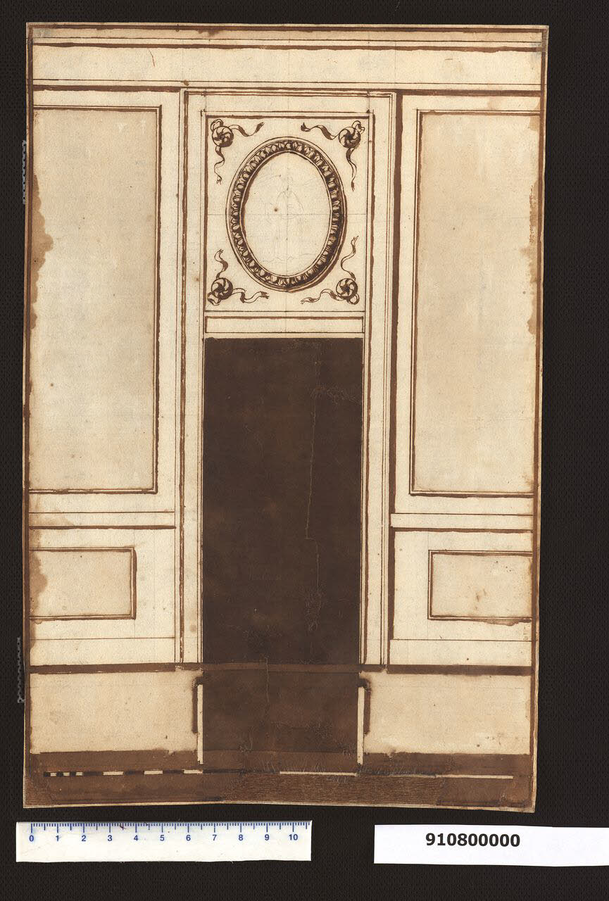 disegno in scala, conserva tracce della preliminare costruzione a grafite con tiralinee; è eseguito a inchiostro bruno a penna, principalmente con tiralinee, a mano libera nei dettagli decorativi; al centro dell'ovale figurazione non precisabile schizzata a matita; le ombreggiature sono stese con acquerellature di inchiostro bruno; il supporto sul quale è tracciato è carta avorio con marginatura a inchiostro bruno