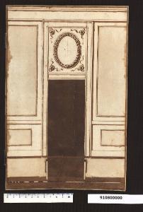 - NOTIZIE STORICO CRITICHE Dopo una lunga serie di contatti con Carlo Bianconi, interpellato per mettere a punto le idee per la villa a Pieve Santo Stefano del marchese Giacomo Sardini, quest'ultimo giunse a definire l'assetto decorativo della sala principale (Milano, Collezione Sardini Martinelli inv. 9,67) e del salotto (ibidem inv. 9,111). In una fase immediatamente antecedente, quando ancora si pensava di decorare i sopraporta con cammei ovali (vedi disegno in ibidem inv. 9,108) Sardini aveva tracciato, nel disegno in esame, una soluzione decorativa per una porta della sala, cercando al tempo stesso di fissare il sistema di chiusura a doppio battente. In questo foglio si può notare che l'altezza complessiva del vano è conforme a quella prevista in altre tavole di progetto per la sala (ibidem inv. 9,96 e 9,67) e che profondità del muro e larghezza della porta sono uguali alle misure degli interni. Si potrebbe trattare della parete lunga opposta a quella delineata nei citati disegni, con un'impaginazione che, ribaltando il ritmo di pieni e vuoti previsto sulla parete di fronte, infrange la simmetria suggerita da Bianconi. La villa fu demolita intorno al 1930.