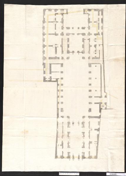 disegno in scala, conserva tracce della preliminare costruzione a grafite; è eseguito a inchiostro nero utilizzando tiralinee e compasso; acquerello grigio nello spessore delle nuove murature; leggere campiture di acquerello giallo nello spessore dei muri dell'edificio preesistente. Il disegno è tracciato su supporto di carta avorio composto da due fogli incollati