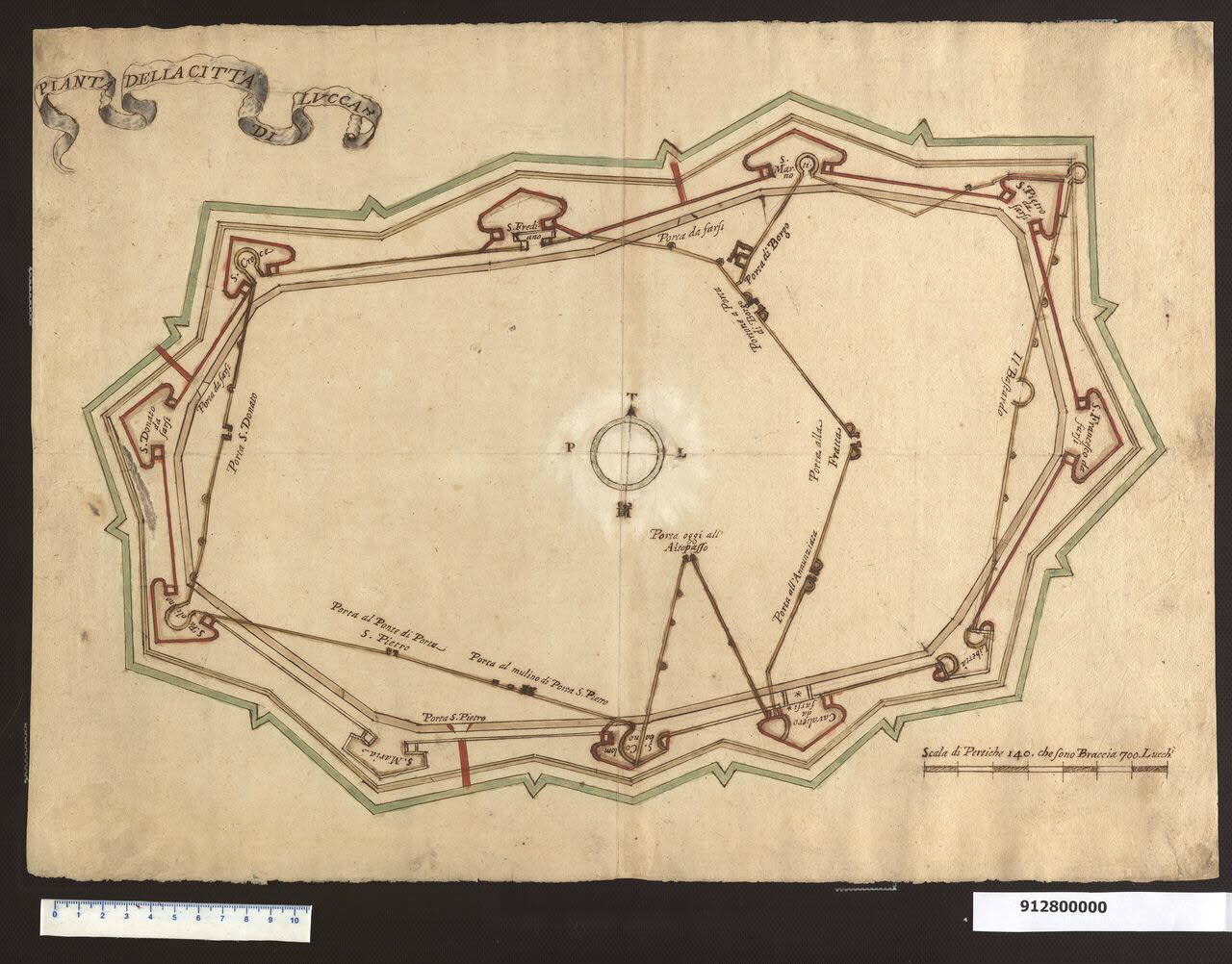 - NOTIZIE STORICO CRITICHE In questa pianta della città di Lucca, Giacomo Sardini traccia con diversi colori le due cinte murarie medievali, quella cinque-seicentesca e le sistemazioni esterne. Grazie alle indicazioni poste sui vari punti dei perimetri di difesa, sono facilmente individuabili le varie porte e baluardi. Un riferimento per questo disegno potrebbe essere la "Pianta delle mura della citta", realizzata nella seconda metà del sec. XVII e conservata presso l'Archivio di Stato di Lucca, Fondo Stampe 487, che Sardini potrebbe aver copiato.