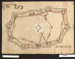 disegno in scala, conserva tracce della preliminare costruzione a grafite; è eseguito a inchiostro bruno utilizzando tiralinee e compasso; campiture di acquerello rosso, ocra e verde distinguono le diverse cinte murarie. Il disegno è tracciato su supporto di carta avorio