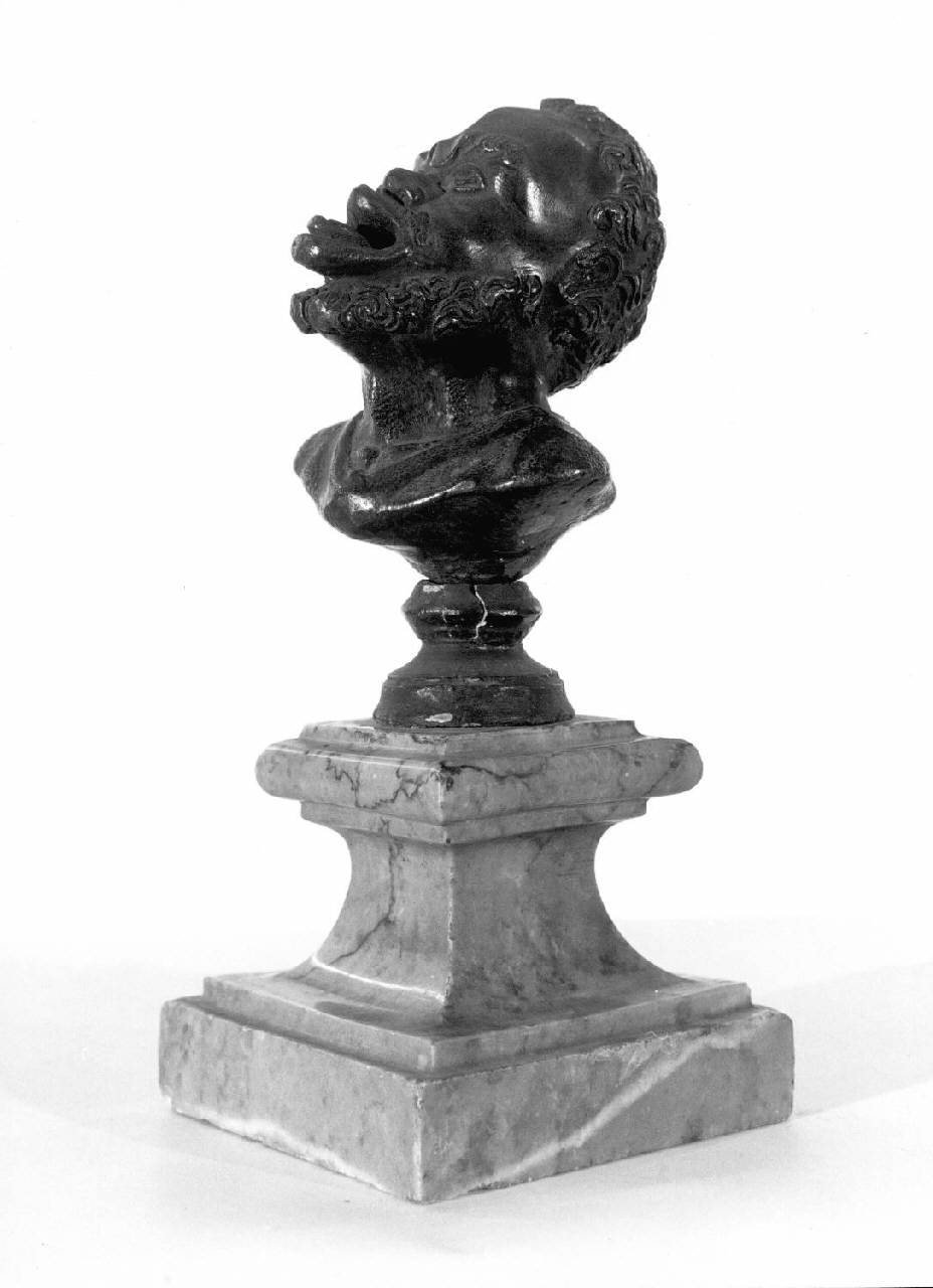 - NOTIZIE STORICO CRITICHE Modello appartenente al gruppo delle piccole lucerne ad olio prodotte dalla bottega del Riccio riproducenti teste fantastiche di negri, con il mento sporgente e in tal guisa atto a sostenere il lucignolo, con un coperchio sul capo e con un manico sulla nuca. A volte queste teste capricciose sono rette da un piedistallo in forma di zampa di uccello rapace o di gallo, la cui mirabile forma naturalistica subita rivela trattarsi di calchi dal vero, procedimento certamente anticlassico, ma consono alle tendenze fantasticheggianti del Riccio e della sua cerchia (Planiscig 1930, p. 19). (C.P.)