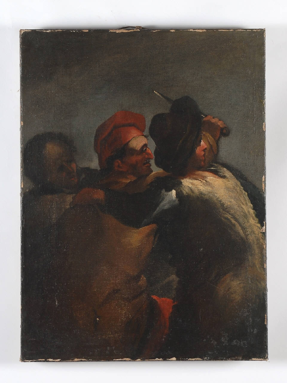 Dipinto privo di cornice raffigurante una rissa fra villani. Dal fondo scuro, privo di ogni elemento che potrebbe distogliere l'attenzione dell'osservatore dal soggetto raffigurato, emergono le figure maschili, rappresentate in diverse posizioni, contraddistinte da un forte realismo nella definizione della fisionomia del volto, quasi caricaturale e grottesco: gli influssi di Caravaggio sono ancora evidenti. La luce proviene da destra, creando effetti chiaroscurali violenti e sottolineando ancor più la ricerca psicologica dei personaggi, data da durezza e naturalezza.