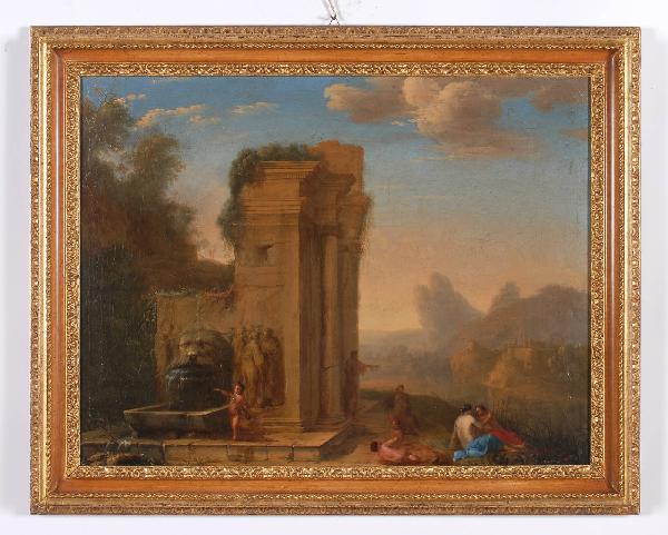 - NOTIZIE STORICO CRITICHE La tela ha subito dei restauri. Secondo Caimi si tratta della scuola di Pierre Patel il Vecchio. Si riporta la scheda tecnica del dipinto compilata dalla Galleria Caretto di Torino: "Autore: Pierre Patel il Vecchio (Piccardia 1605 - 1676 Parigi); Soggetto: Paesaggio laziale con rovine e figure classiche; Firma e datazione: olio su tela cm. 57 x 73, Francia 1650 - 60 circa; Stato di conservazione: ottimo (5% di ritocco); Provenienza: collezione privata; Esposizioni: Galleria Caretto - Torino - Miscellanea Inverno 1980; Bibliografia: Salerno "Pittori di paesaggi del Seicento a Roma" vol. II p. 494; Nota: sebbene l'artista non si sia mai recato a Roma, risente in questa sua bella opera dell'influenza stilistica del Lorena nel paesaggio, del Breenbergh nell'architettura, del Poelemburg nelle figure. Da Luigi Salerno "Pittori di paesaggi del Seicento a Roma" vol. II p. 494 (estratti). Le fonti dicono che Patel non venne mai in Italia, ma riesce difficile crederlo (vedi un'opera giovanile, Paesaggio, in collezione Mahon, che ha una maniera pittorica un pò secca, che rimarrà tipica del Patel anche in seguito). Fu scolaro del Vouet e dal 1635 fu membro dell'Accademia di Parigi...".