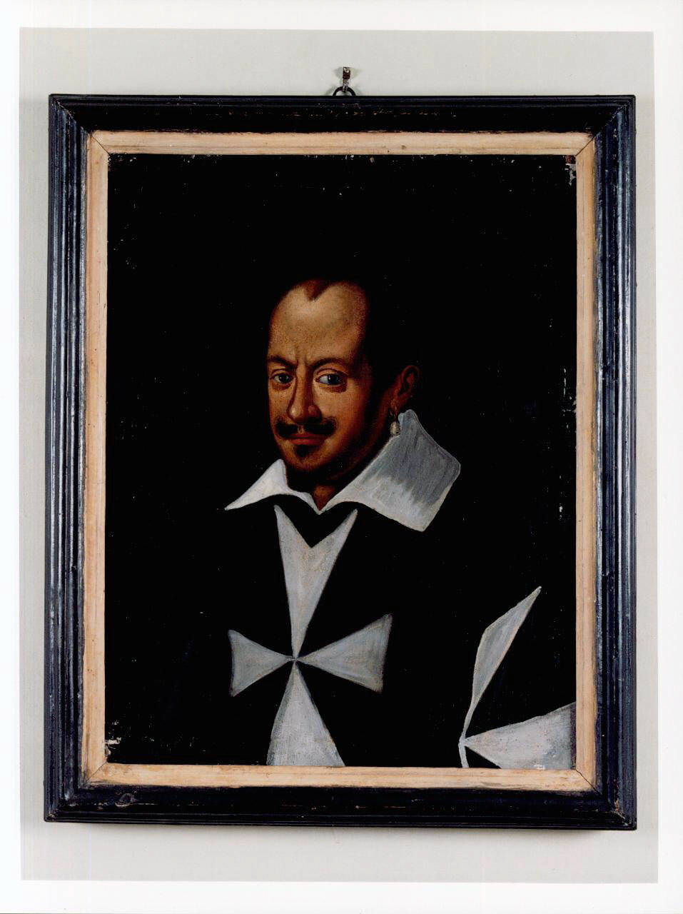 Dipinto inserito in semplice cornice di legno verniciato raffigurante il ritratto di un cavaliere. Dal fondo scuro e compatto, privo così di ogni elemento che potrebbe distogliere l'attenzione dell'osservatore dal personaggio raffigurato, emerge il ritratto maschile, con abito scuro, ampio collo bianco della veste sottostante e croce bianca nella parte anteriore dell'abito. La posa è di tre quarti; risalta la ricerca di realismo per quanto riguarda la fisionomia del volto. La luce proviene da sinistra dando origine a contrasti di luci e ombre.