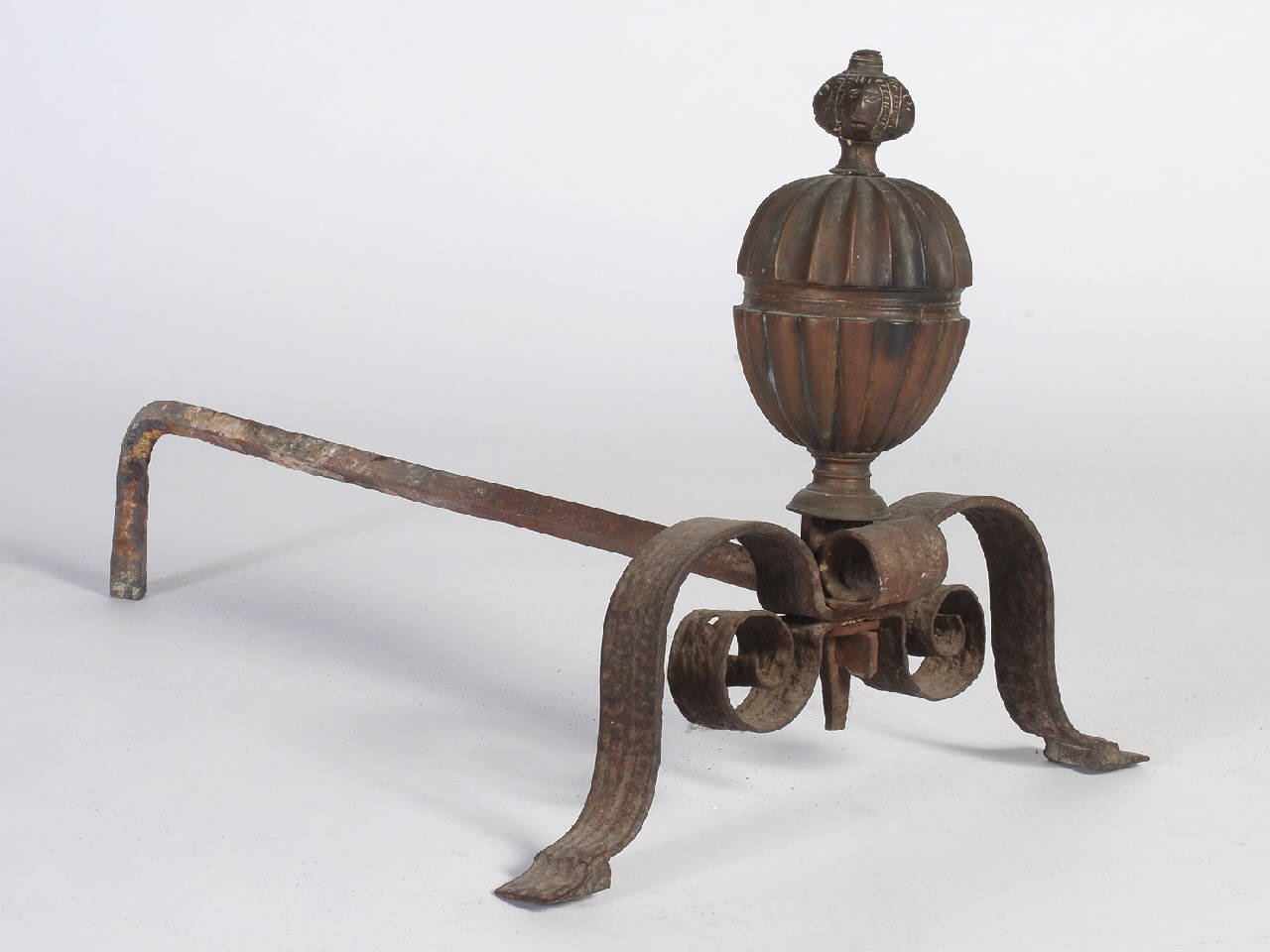Coppia di alari da camino con forma ad elle, base anteriore formata da due gambe a voluta con coronamento superiore a forma ovoidale scanalata e pomolo con raffigurazioni di volti stilizzati