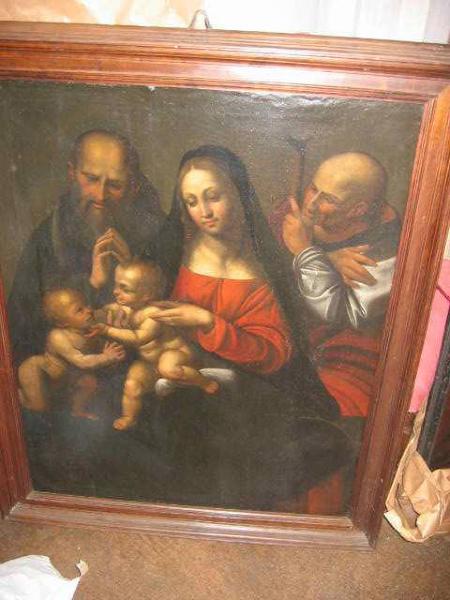 Dipinto inserito all'interno di una semplice cornice in legno verniciato, raffigurante la Sacra Famiglia con San Giovannino e un santo sulla sinistra. Dal fondo scuro, privo di ogni elemento che potrebbe distogliere l'attenzione dell'osservatore dal soggetto del dipinto, emergono in primo piano le forme piene e incombenti dei personaggi rappresentati, che occupano quasi per intero la superficie pittorica messa a disposizione. La luce proveniente da sinistra, crea passaggi graduali di chiaroscuro, che sottolineano il modellato morbido dei corpi e i toni accesi di colore per quanto riguarda le vesti; nel complesso predominano tonalità calde per la gamma cromatica utilizzata. Gli sguardi sono rivolti al legame che intercorre tra Gesù Bambino e San Giovannino, dato da profonda intesa interiore.