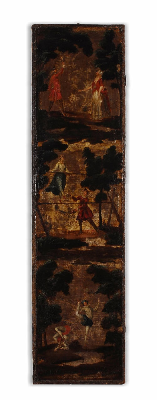 Pannello in cuoio dipinto ad olio con scena di galanteria e di acrobati. Lo spazio risulta diviso in verticale in tre registri sovrapposti; ogni scena presenta un fondo dorato ed è delimitata sia a sinistra che a destra da piante che creano una sorta di quinta scenografica e teatrale. Predominano tonalità calde di colore; i corpi sono resi mediante modalità tipiche dell'epoca, risultando esili e scattanti.