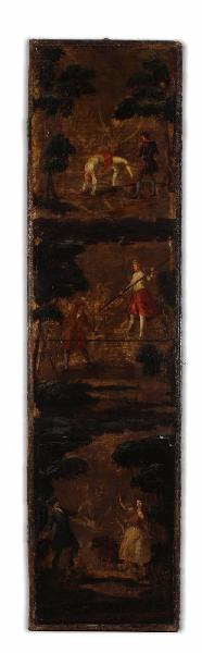 Pannello in cuoio dipinto ad olio con scena di galanteria e di acrobati. Lo spazio risulta diviso in verticale in tre registri sovrapposti; ogni scena presenta un fondo dorato ed è delimitata sia a sinistra che a destra da piante che creano una sorta di quinta scenografica e teatrale. Predominano tonalità calde di colore; i corpi sono resi mediante modalità tipiche dell'epoca, risultando esili e scattanti.