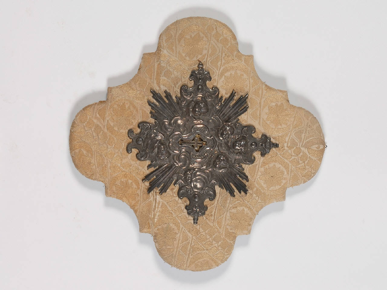 Frammento di reliquiario a ostensorio o di sportello di tabernacolo in lamina d'argento sbalzata. Motivi decorativi dati da teste di cherubini tra nuvole, motivi a riccioli e raggi solari. Al centro, croce in cristallo.