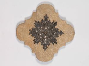 - NOTIZIE STORICO CRITICHE Il frammento di reliquiario o di sportello di tabernacolo è stato applicato in epoca recente su un supporto ligneo polilobato rivestito di tessuto operato. Nell'armeria al piano terra della villa, si custodisce la scatola in cui era contenuto il tutto.