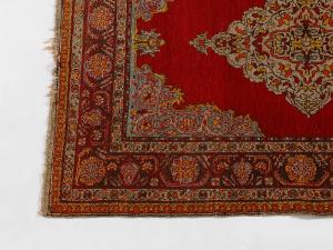 Tappeto orientale a fondo rosso. L'ordito è costituito dai fili verticali; la trama, che dà compattezza al tappeto, dai fili orizzontali; gamma particolarmente vivace di colori.