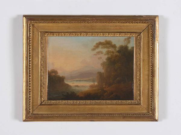 Dipinto inserito entro una cornice lignea dorata arricchita da motivi geometrici modulari e motivi stilizzati di origine vegetale. Raffigura un paesaggio animato da figure in primo piano, declivi rocciosi, specchio d'acqua, alberi e colline che sfumano all'orizzonte. Il cielo diventa maggiormente luminoso all'orizzonte uniformandosi con il paesaggio rappresentato. Contrasti armonici tra tonalità calde e tonalità fredde di colore; non predomina la linea ma la macchia di colore nella definizione degli elementi che compongono il soggetto, i cui contorni risultano sfumati.