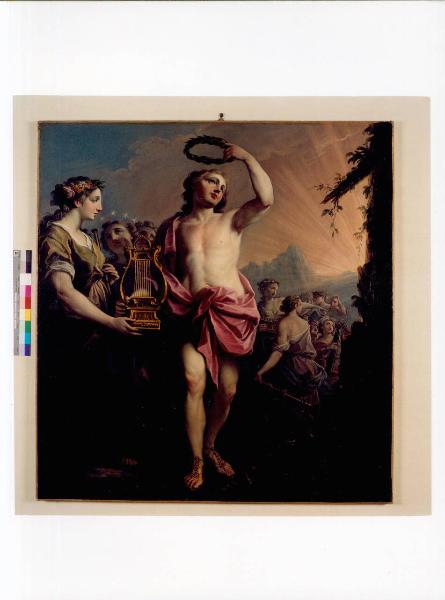 Il dipinto, a olio su tela, è di formato rettangolare orientato in vertic\nale ed è privo di cornice. Raffigura "Apollo e le Muse"; datato 1791, è \nopera di un pittore dell'Italia Settentrionale e fonde ai temi neoclassici suggestioni già romantiche.