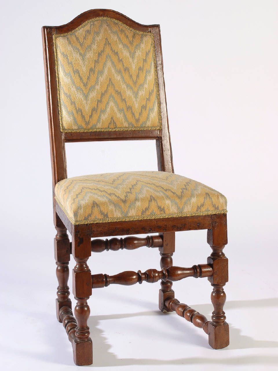 sedia imbottita con gambe a rocchetto riunite da traverse; schienale sagomato con sostegni mossi