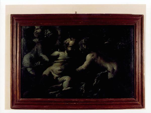 Dipinto entro una semplice cornice in legno verniciato, raffigurante dei putti. Dal fondo scuro, privo di ogni elemento, emergono le figure in primo piano, rappresentate in diverse posizioni e atteggiamenti umani. I corpi sono maggiormente evidenziati dai bagliori luminosi che mettono in risalto la rotondità e la morbidezza delle forme e del modellato, dando vivacità al soggetto in generale.