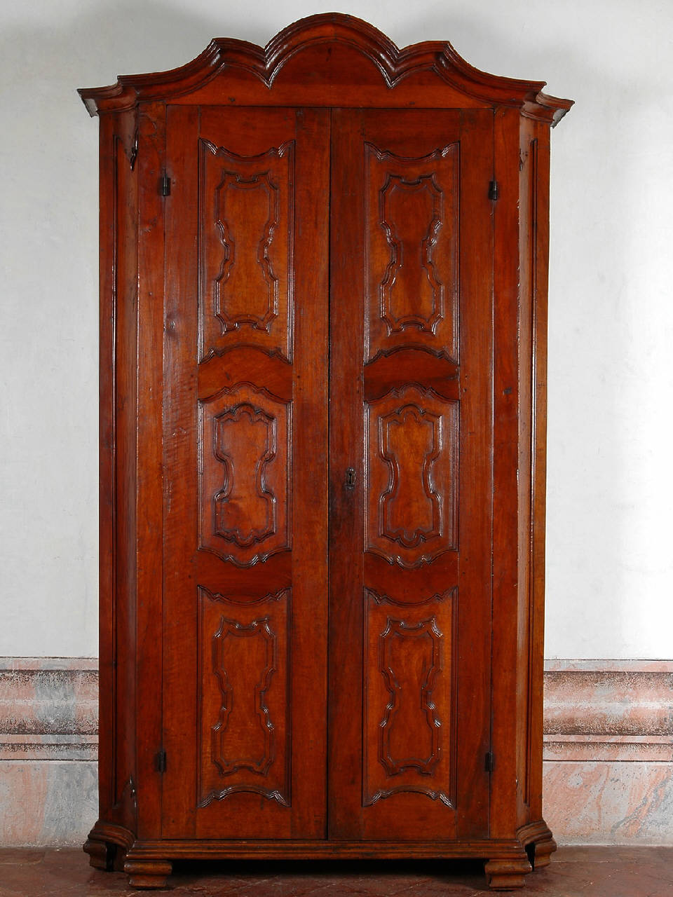 armadio in noce intagliato con cimasa ad arco, ante con specchiature mistilinee e fianchi mossi.