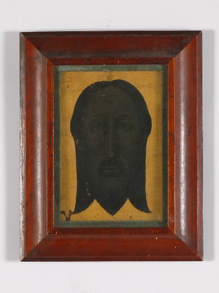 Dipinto inserito in una semplice cornice lignea dipinta di rosso. Da uno sfondo dorato emerge la testa del Cristo, realizzata con tonalità molto scure di colore e grande semplificazione generale per quanto riguarda la ricerca anatomica del volto.