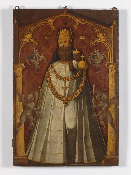 Icona raffigurante Madonna con Bambino. Sia all'estrema destra e all'estrema sinistra si intravedono due colonne con relativo capitello, poggianti su un basamento, che idealmente sorreggono un arco polilobato, decorato da motivi decorativi vegetali stilizzati, da cui pendono lampade pensili: il tutto crea una sorta di quinta scenografica e teatrale. Due angeli in volo, uno per lato, sorreggono due candelieri con candele accese. La figura della Vergine è impreziosita da sontuosi gioielli.