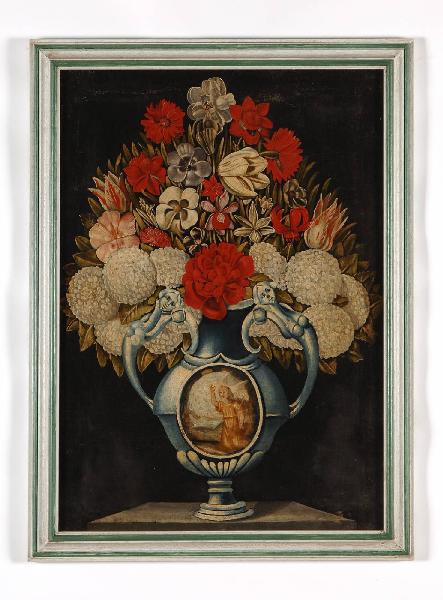 Dipinto inserito in una semplice cornice di legno verniciato, di moderna fattura, raffigurante un vaso con fiori. Dal fondo scuro, privo di ogni elemento che potrebbe distogliere l'attenzione dell'osservatore dal soggetto rappresentato, emerge in primo piano un vaso colmo di una svariata quantità di fiori. Il vaso, posto su un semplice piano di appoggio in prospettiva centrale, presenta due anse a mò di cariatide, una decorazione con bacellatura alla base e un ovale centrale figurato. La naturalezza della massa floreale è suggerita inoltre dalla luce che sottolinea i vari particolari descrittivi e naturalistici. Una luce che si diffonde uniformemente sul soggetto rappresentato evidenziandone ancor più i colori accesi e smaltati; contrasti tra tonalità fredde, che si trovano principalmente nel vaso e tonalità calde che caratterizzano la variopinta massa di fiori.