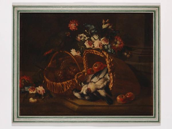 Dipinto inserito in una semplice cornice di legno verniciato, di moderna fattura, raffigurante una natura morta con frutta, fiori e volatili. Dal fondo scuro, dove si intravede a fatica un basamento di pilastro all'estrema destra, emergono in primo piano delle ceste impagliate con all'interno dei frutti, vari tipi di fiori e dei volatili: il tutto è posto su un piano di appoggio modanato. La luce proveniente da sinistra mette in evidenza i vari soggetti che compongono il dipinto, i diversi materiali e le loro caratteristiche, per esempio l'aspetto morbido del piumaggio degli uccelli, la rotondità delle mele, la freschezza, il tono variopinto e vivace dei fiori. Predomina nel dipinto il colore steso a macchie in diverse gradazioni, attraverso tocchi veloci: contrasti tra tonalità calde e tonalità fredde.