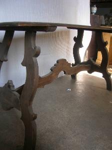 Tavolo fratino con piano rettangolare poggiante su montanti a lira raccordati da traverse sagomate.