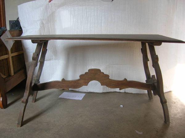 Tavolo fratino con piano rettangolare poggiante su montanti a lira raccordati da traverse sagomate.