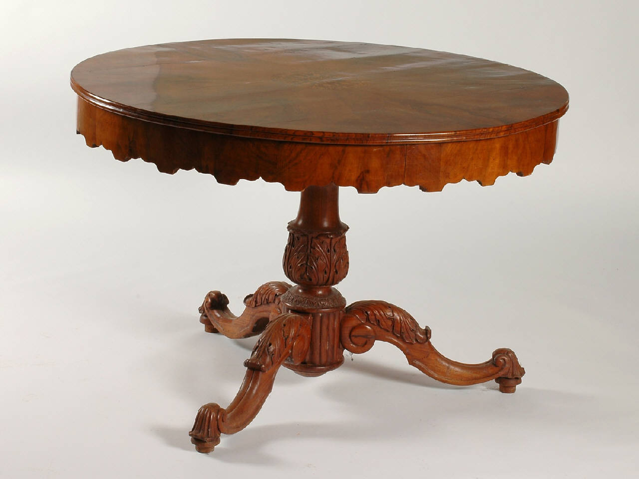 Tavolo con piano circolare dal ciglio modanato e con motivo floreale ad intarsio nel centro, fascia mistilinea, montante centrale a balaustro da cui si dipartono tre gambe scolpite a riccioli e volute con foglia d'acanto nella parte superiore; lo stesso motivo decorativo torna nel nodo centrale a bulbo del balaustro.