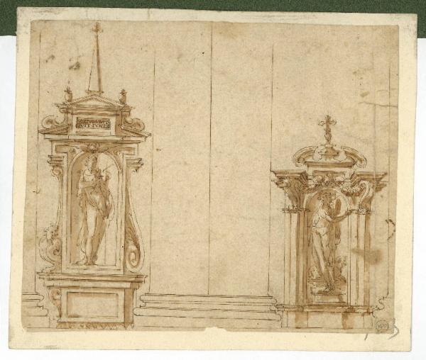 Foglio con due progetti per decorazione parietale: a sinistra, l'autore ha tracciato lo studio, in due possibili varianti, per una nicchia che racchiude la statua di un santo ed è sormontata da una lapide con iscrizione in lettere capitali, forse di carattere funebre; a destra, una seconda nicchia, di dimensioni inferiori,ospita la statua di San Giovanni Battista con l'agnello ai piedi, Il disegno è eseguito a penna e inchiostro bruno acquerellato su carta bianca. Controfondato.