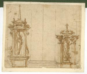 - NOTIZIE STORICO CRITICHE Alcune foto del disegno, non datate, sono conservate nell'album Lampugnani D. 11. Nessuna attribuzione è mai stata proposta per questo bel foglio di studi, che reca due diversi progetti per nicchie con statue, in diverse varianti: il tratto a penna fine e preciso, l'acquerellatura leggera, le figurette eleganti e capricciose, che rivelano la mano di un artista educato sui testi della grande maniera romana e fiorentina, possono però essere accostati, mi sembra, a quelli che abitualmente usa Jacopo Zucchi (Firenze 1541 ca. - Roma 1596), allievo a Firenze di Giorgio Vasari, e poi attivo, per lunghi anni a Roma; in particolare, si vedano per confronto gli studi per la decorazione, mai realizzata, della galleria di Villa Medici a Roma, ora conservati a Londra (The Victoria and Albert Museum, Department of Prints and Drawings, e British Architectural Library Drawings Collection; cfr. "Villa Medici: il sogno di un cardinale. Collezioni e artisti di Ferdinando de' Medici", a cura di M. Hochmann, catalogo della mostra, Roma 1999, pp. 278-281).